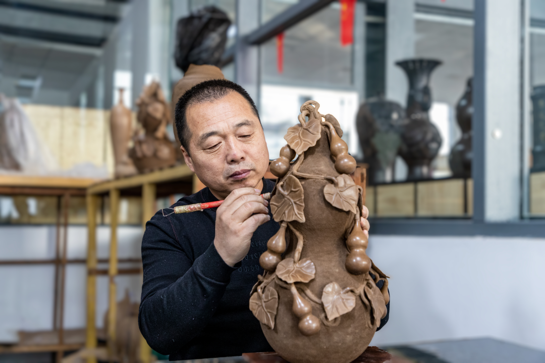 黑陶是華夏先民的黑色詩篇,作為土生土長的濟陽人,三十余載光陰里,徐慶增潛心研究黑陶,續(xù)寫這光輝的詩篇。如今,他的作品早已超越實用范疇,成為兼具藝術(shù)價值與文化厚度的非遺名片。《龍騰盛世》以華夏龍為魂,將泥與火的淬煉推向極致?!陡酆J》造型圓潤飽滿,釉色沉郁如墨玉,無需多言,一抹玄色間,福氣已悄然落定?!豆淖友砀琛穭t將田間地頭的歡騰瞬間凝固于陶面,讓人仿佛聽見咚咚的鼓點,看見祖輩們在黃河邊舞出的煙火人間。這些凝聚著心血的創(chuàng)作,不僅是他個人的藝術(shù)成就,更成為高校非遺教學中鮮活的教材。